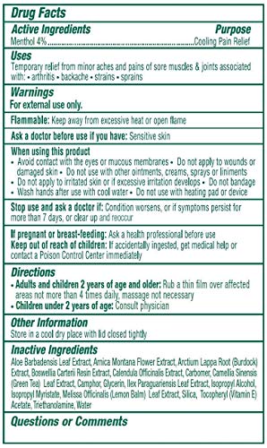 Unique cooling menthol formula is backed by science and research-proven to deliver fast acting, long lasting and deep penetrating pain relief for sore muscles, backaches, sore joints, and arthritis
